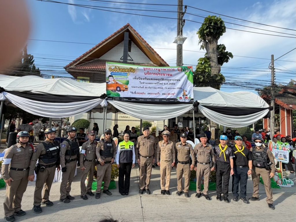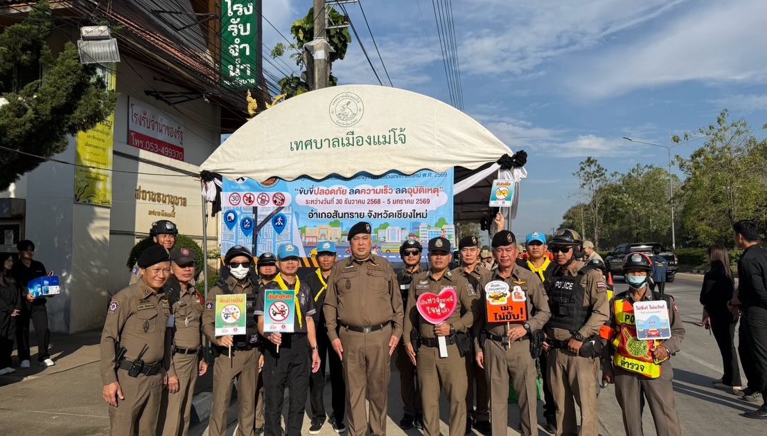 พ.ต.อ.พลจักร บุนนาค ผกก.สภ.แม่โจ้, พ.ต.ท.ณัฐพงศ์ สุขทาน รอง ผกก.ป.สภ.แม่โจ้, พ.ต.ต.แดน แสนอาสา สวป.สภ.แม่โจ้, พ.ต.ท.ถวิล กูลพรม สวป.(ชส.)สภ.แม่โจ้ พร้อมเจ้าหน้าที่ตำรวจสายตรวจ, จราจร และชุดชมส.สภ.แม่โจ้ ร่วมพิธีเปิดจุดตรวจบูรณาการป้องกันลดอุบัติเหตุทางถนนและด่านชุมชนในช่วงเทศกาลปีใหม่ พ.ศ.2569 ร่วมกับเจ้าหน้าที่ฝ่ายปกครองอำเภอสันทราย กำนัน ผู้ใหญ่บ้าน โดยมี นายนพดล สุระสังวาลย์ นายอำเภอสันทรายเป็นประธานในพิธี ณ จุดตรวจบูรณาการเทศบาลเมืองแม่โจ้ ตำบลหนองหาร อำเภอสันทราย จังหวัดเชียงใหม่