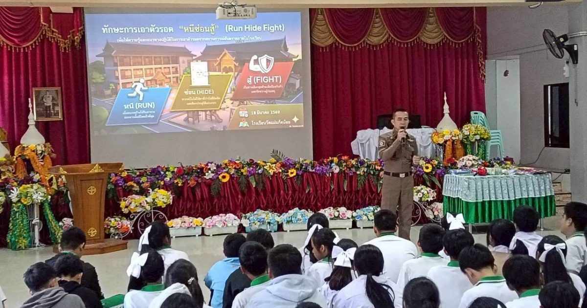 โดยการอำนวยการของ พ.ต.อ.พลจักร บุนนาค ผกก.สภ.แม่โจ้, พ.ต.ท.ณัฐพงศ์ สุขทาน รอง ผกก.ป.สภ.แม่โจ้ มอบหมายให้ พ.ต.ท.ถวิล กูลพรม สวป.(ชส.)สภ.แม่โจ้, ร้อยเวร20,201,สายตรวจ121, สายตรวจป่าไผ่, สายตรวจหนองจ๊อม และชุดชมส.สภ.แม่โจ้ ร่วมกิจกรรมบรรยายให้ความรู้และซักซ้อมแผนเผชิญเหตุฉุกเฉินและเหตุการณ์อันตรายในโรงเรียน เหตุกราดยิง(หนี ซ่อน สู้) ณ โรงเรียนวัดแม่แก้ดน้อย ต.ป่าไผ่ อ.สันทราย จว.เชียงใหม่